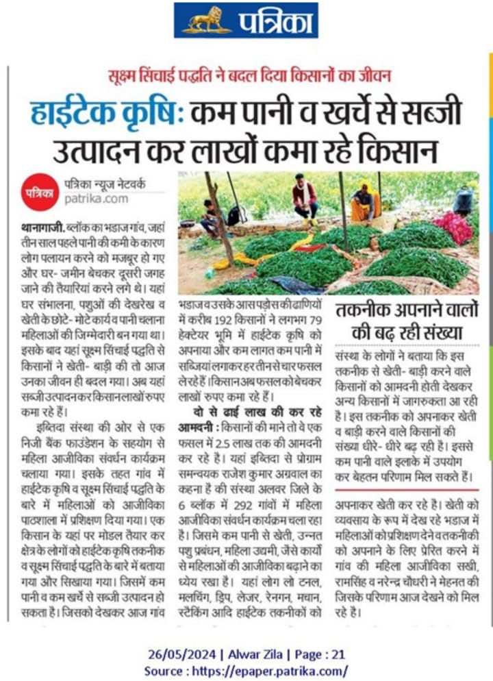 इब्तिदा संस्था में आजीविका कार्यक्रम के लीड और हाईटेक खेती को आगे बढ़ाने वाले डॉ. राजेश अग्रवाल कहते हैं कि “इब्तिदा द्वारा अलवर जिले के 6 ब्लॉक के 292 गांवों में महिला आजीविका संवर्धन कार्यक्रम चला रही है। हमारा सपना है कि कम पानी व उन्नत तरीकों से खेती, उन्नत पशु प्रबंधन, महिला उद्यमी, मुर्गीपालन जैसे अन्य कार्यो से महिलाओं की आजीविका बढ़े। यहां लोग लोटनल, मलचिंग, ड्रिप, लेजर, रेनगन, मचान, स्टैकिंग, नर्सरी आदि हाईटेक तकनीको को अपनाकर खेती कर रहे हैं और खेती को व्यवसाय के रूप में देख रहे हैं।“
